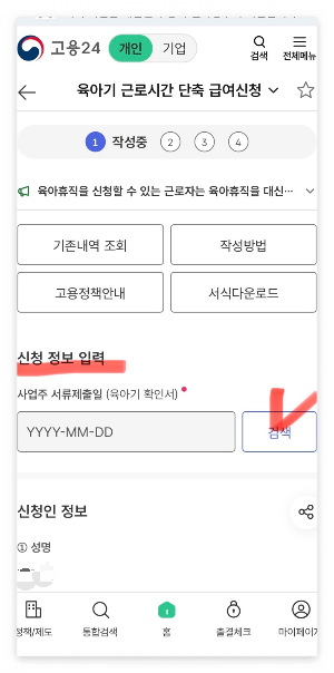 2. 로그인 후 '육아기 근로시간 단축 급여 신청' 검색해서 체크