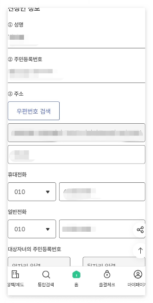 -> 본인 성명, 주민등록번호, 주소, 전화번호, 자녀주민등록번호 등 개인정보 입력합니다.